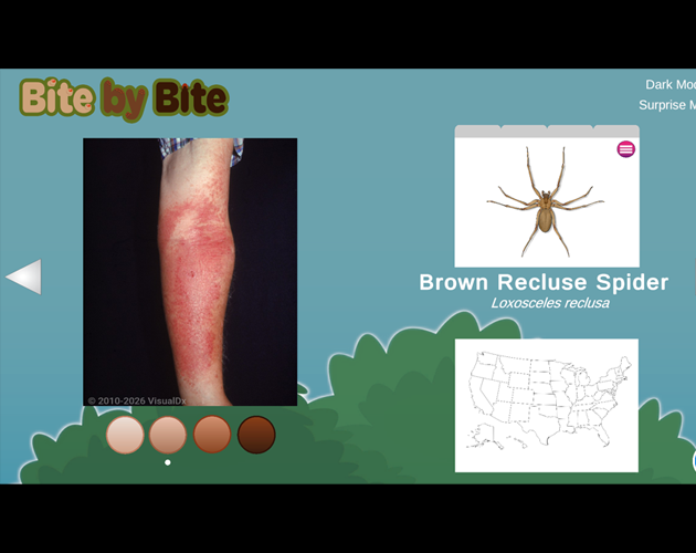 Our group wanted to create a didactic interactive app that focused on the ways bug bites can present on different colored skin. Users are able to click through multiple clinical photos to identify their bites and read relevant information on symptom onset and duration. Users are also able to see and recognize an illustrated image of the bug that could have potentially bit them as well as an animated map of the United States showing the bug’s habitat range. Finally, viewers are able to review treatment options for peace of mind.